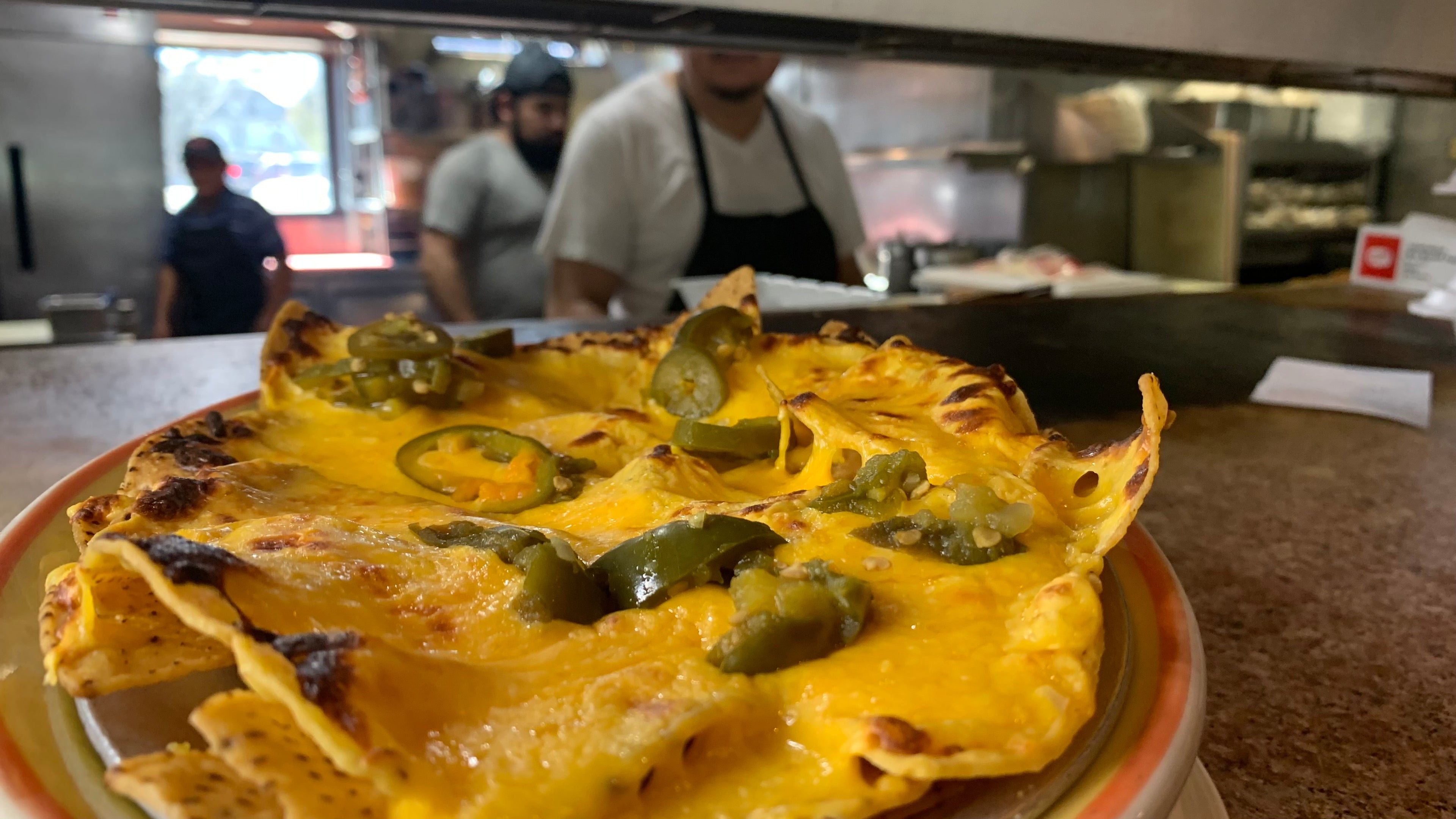A crispy corn tortilla with melted cheese, beef, beans, jalapeno, onion, tomato, served with rice