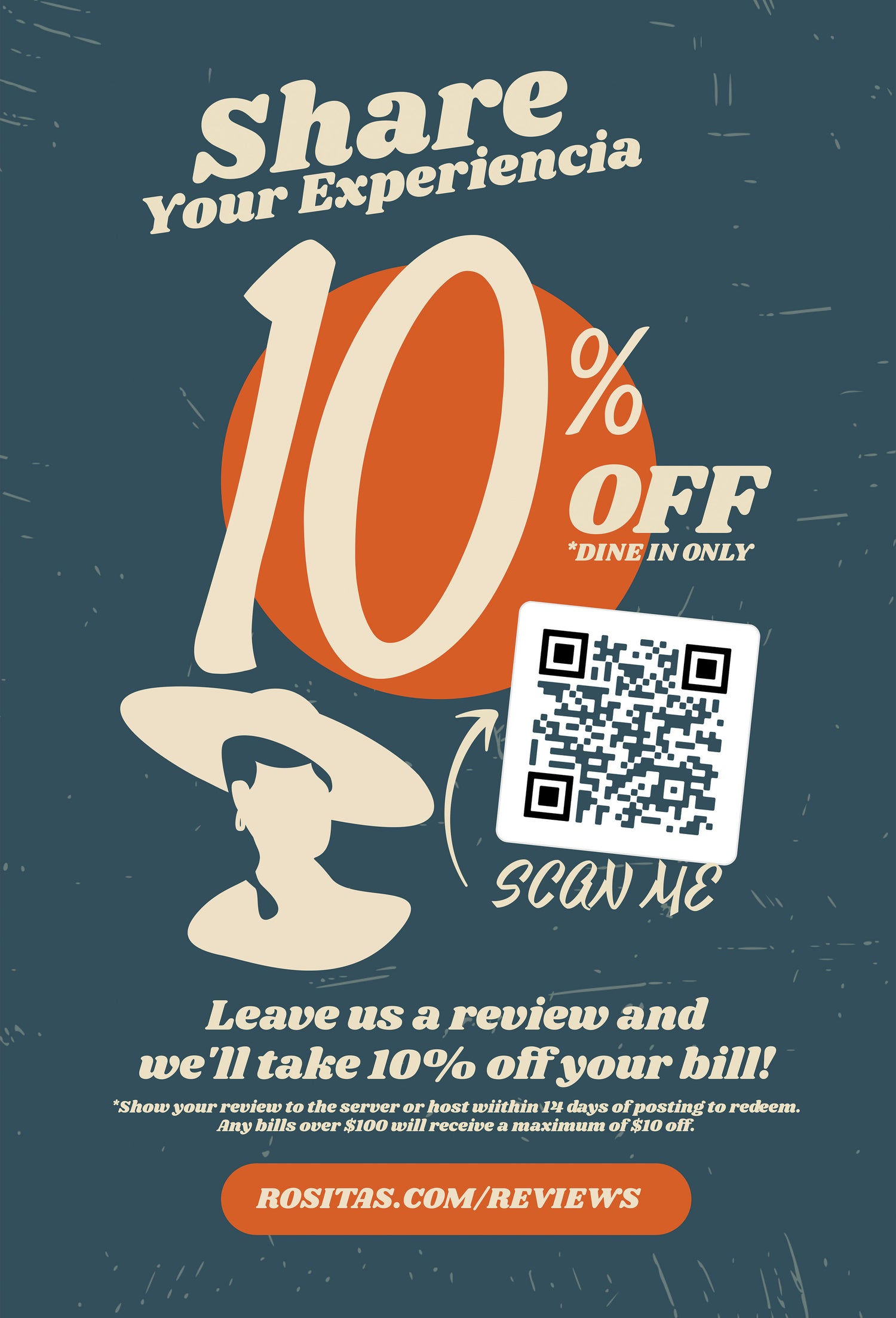 - Show Us at Rosita's: Show your review to the server or host within 14 days of posting to redeem. Any bills over $100 will receive a maximum of $10 off. ¡Así de simple!