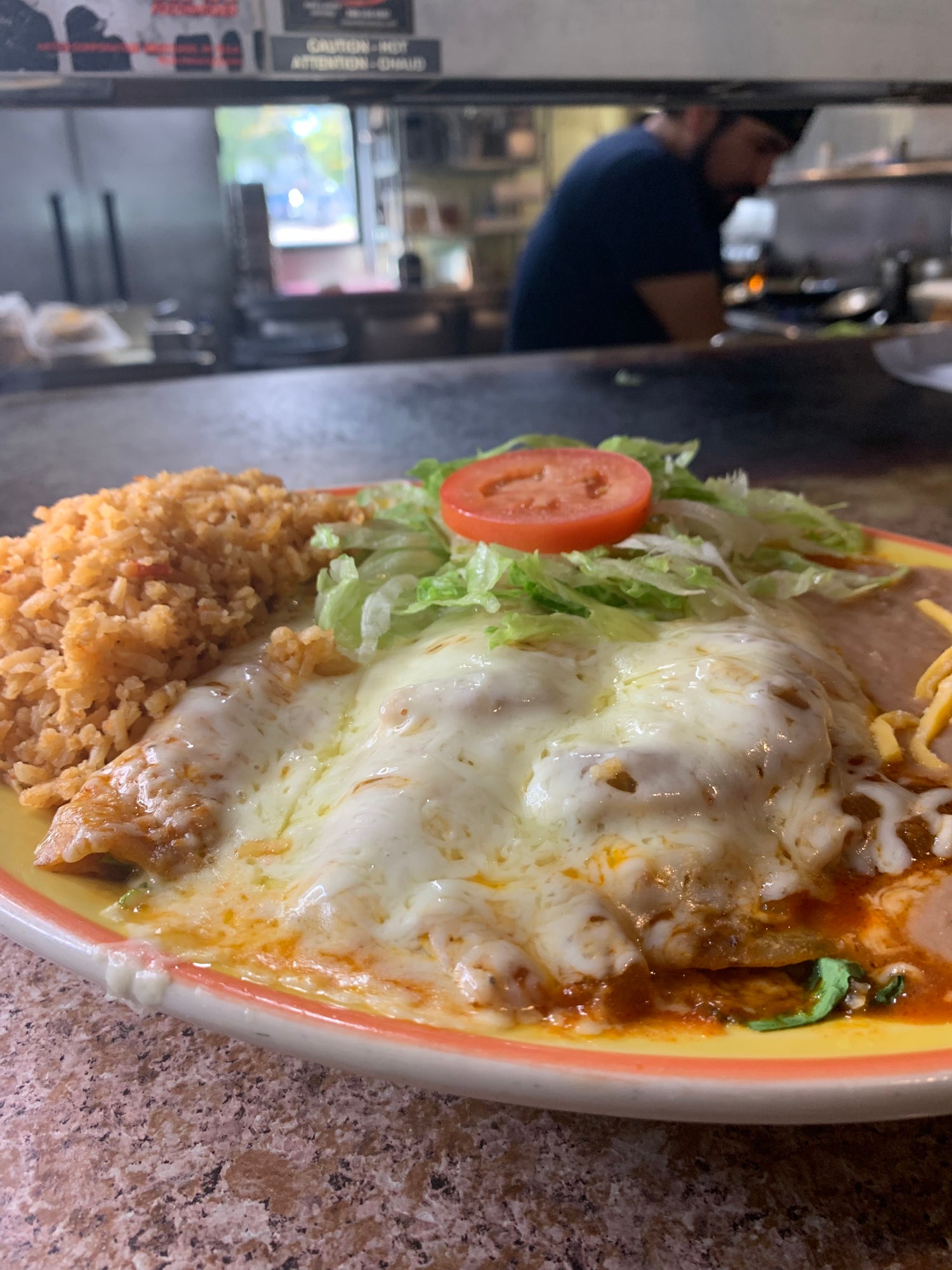 Three enchiladas filled with steak and onion topped with Monterey Jack cheese. Served with rice and beans.