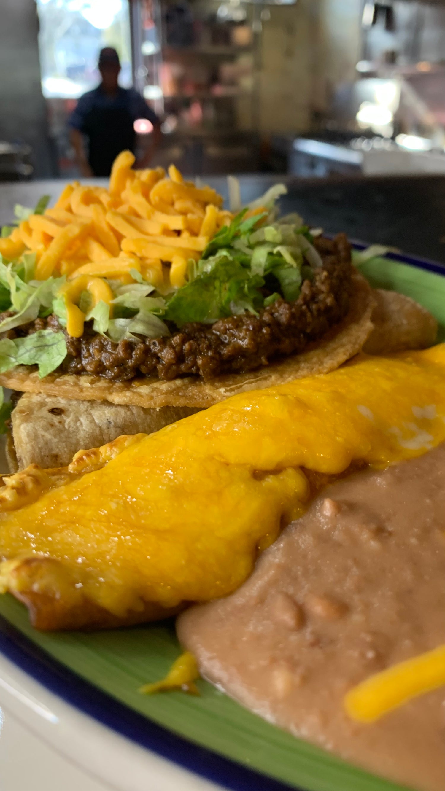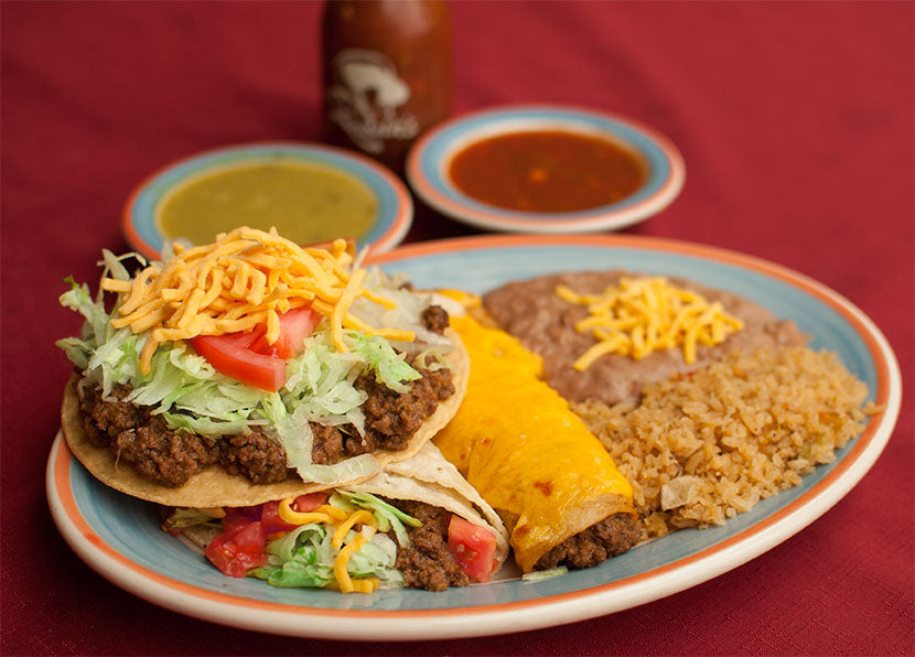 Two beef enchiladas, one beef taco, served with rice and beans.