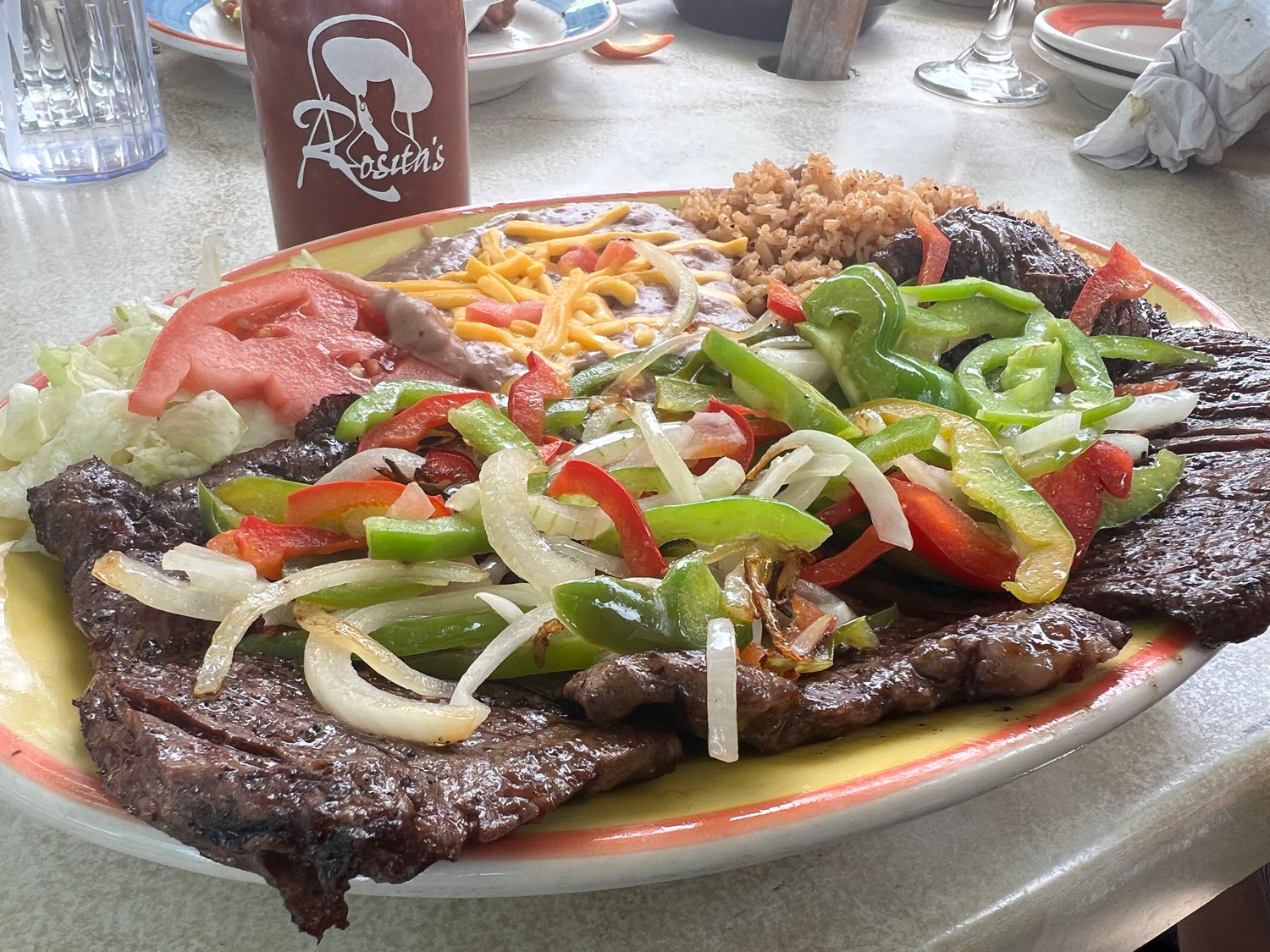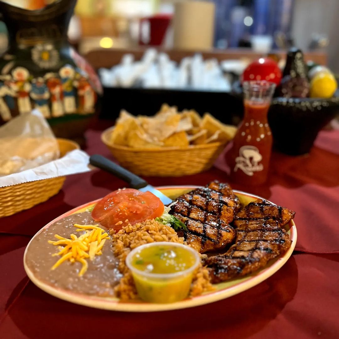 Grilled Mexican steak, smothered with grilled bell peppers and onions or our Ranchero sauce, served with rice, beans, lettuce, tomato, and four tortillas.