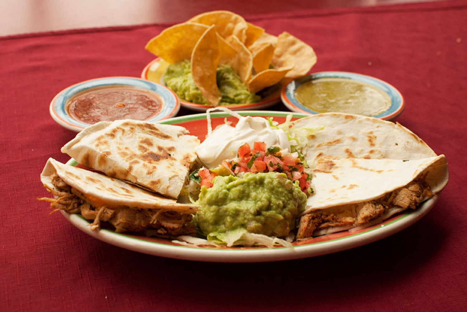 Two tortillas filled with chicken, cheese, and onions. Served with lettuce, guacamole, sour cream, and pico de gallo.